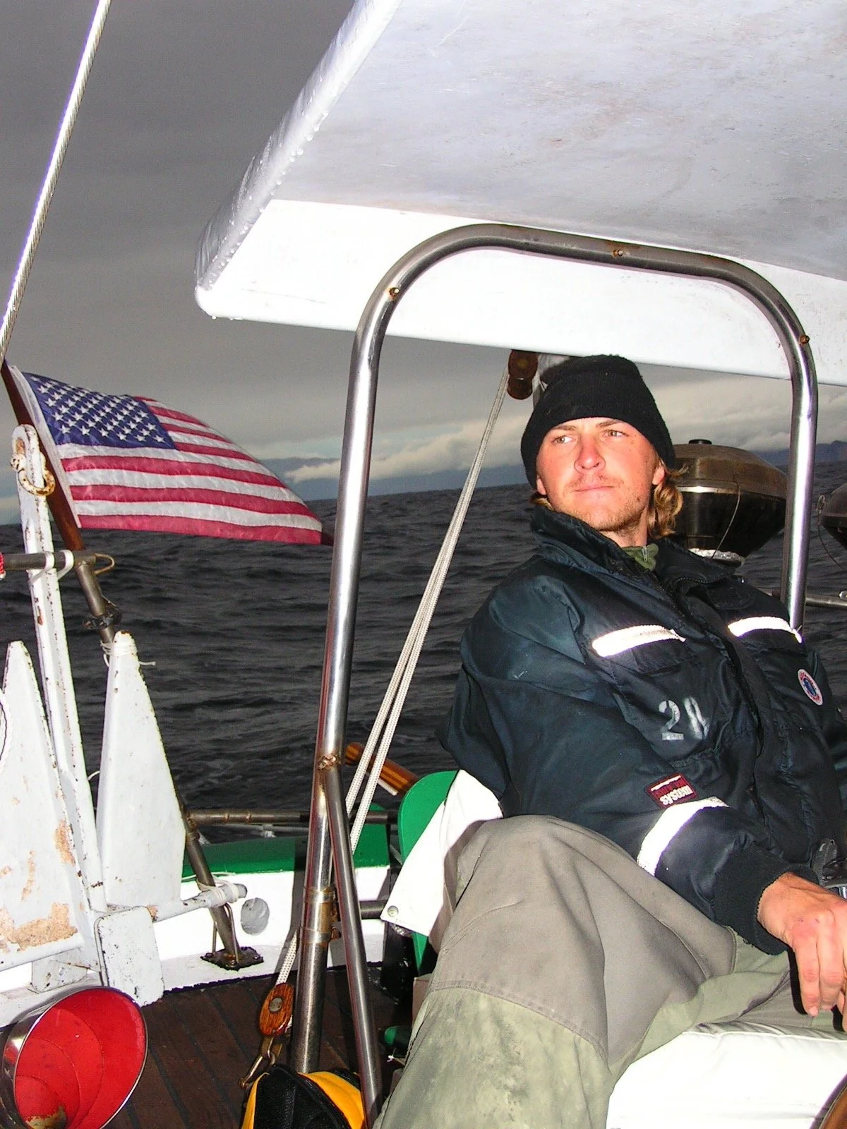 I sat still looking out from under the hood of my rain gear. The night is black, and as the lightning flashes beads of rain illuminate in the scope of my vision and I can see the calm sea and the rain swept water. I watch the sails catching the little wind from the front. Silently I sit, cold and wet watching for the break in the clouds when the storm will pass over us and once again we can make good time through the water. I look at the watch clock and it is six hours after I took the watch. Four hours into a squall, and only two until the sun will rise.
